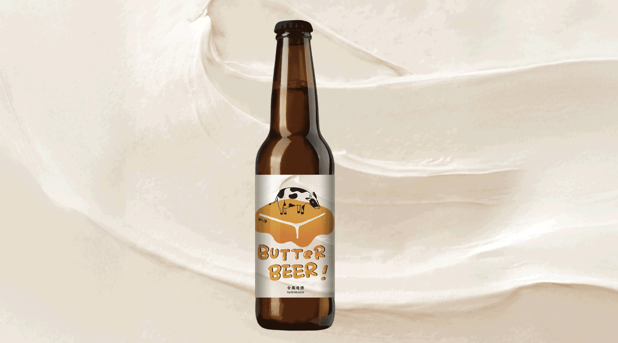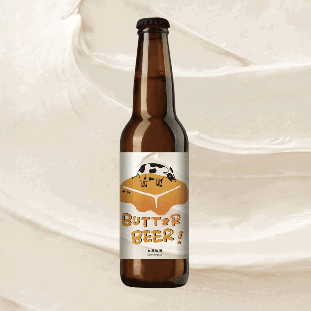 另一支台風造酒今年非常受矚目的全新商品,是與來自高雄,全台第一家本土自產奶油品牌「19號」,攜手合作推出的「奶油啤酒」,是台灣第一瓶由台灣乳源所製作的手工發酵奶油啤酒!以調酒技巧中常見的奶洗技法洗出奶油的風味後,再與啤酒原料混釀,打造出令人難以抗拒的限量風味,前段撲鼻而來的濃郁牛奶糖挾帶著堅果香氣,中段充斥著麥芽與乳香,後段則是有些草本和淡淡的果香。香氣濃郁卻口感清爽,絕對值得一試!