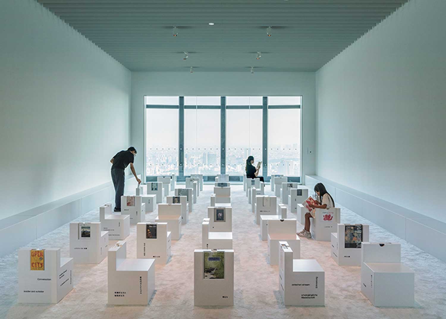 第 3 展區「間之書廊」則是在開放空間中設置了由選 書總監幅允孝所策劃的書籍沙龍。書籍的選擇與陳 列,以從藤本建築汲取的靈感,規劃成五大主題。