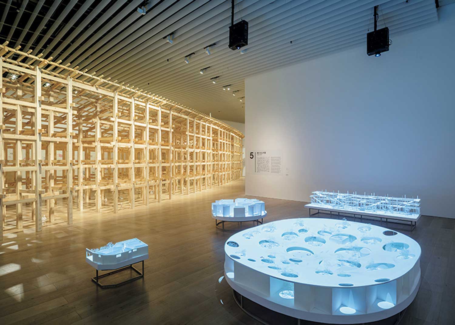 第 4 展區「動態之森」,以投影方式將人們的 動態映射在建築模型上。照片的深處可以看到第 5 展區「開放之環」中所展示的大屋根環形迴廊局部 模型。