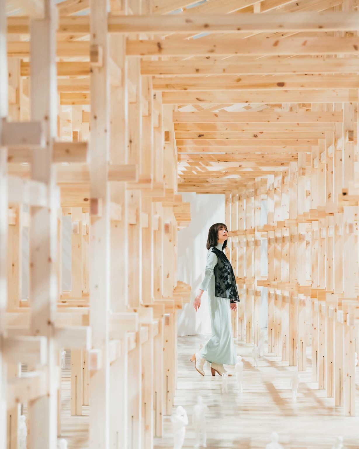藤本:接下來是正在設計中的建築:將仙台音樂廳與東日本大地震的紀念設施結合在一起的專案。這裡展示的是十五分之一比例模型,為了讓大家更貼近真實空間感受,我特地將模型的底板架高設置,讓視點更接近實際狀態。這個建築裡運用了許多既像屋頂又像地板的板狀結構,我的構想是透過音樂讓這些空間能夠凝聚為一體。
