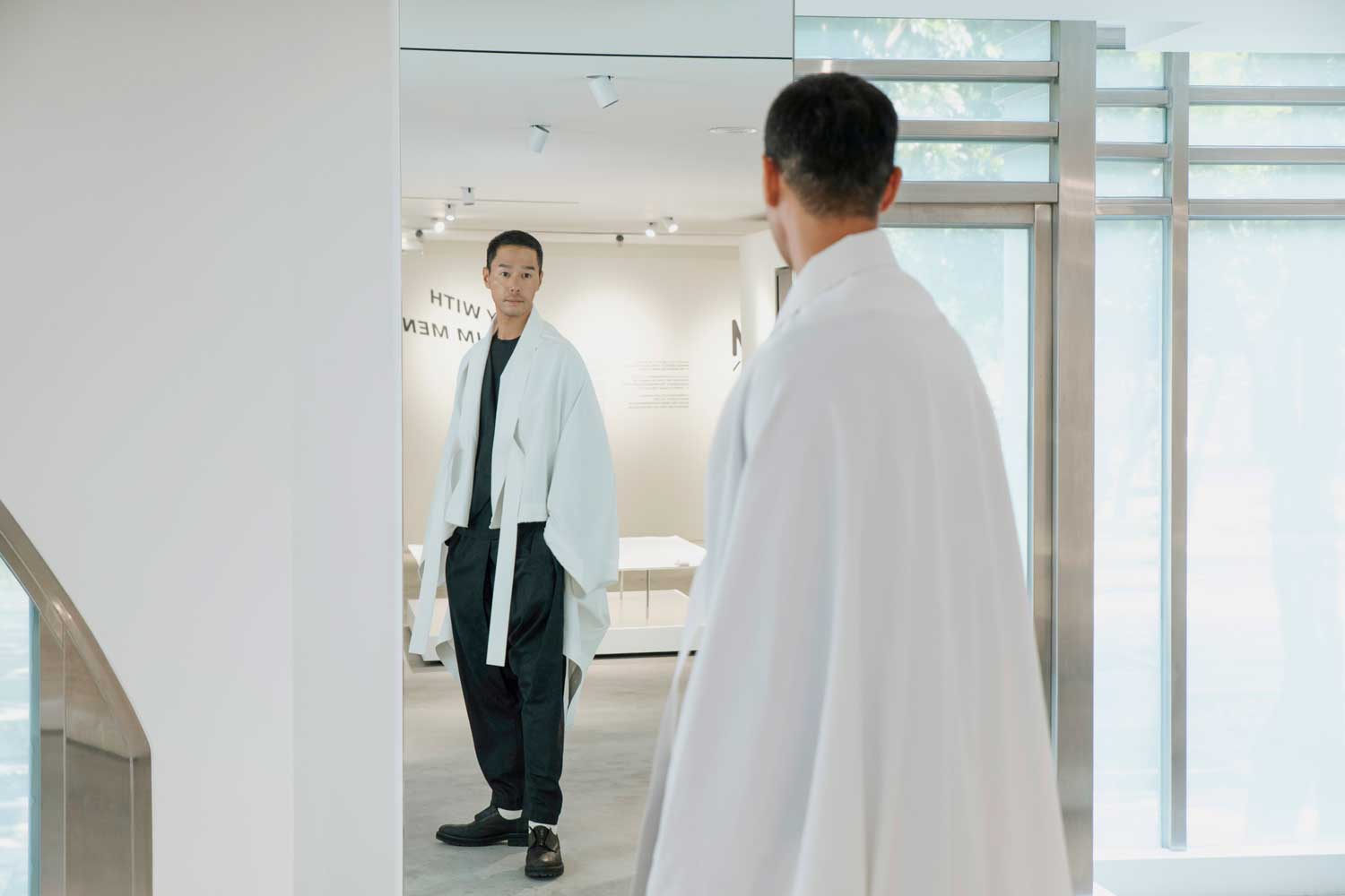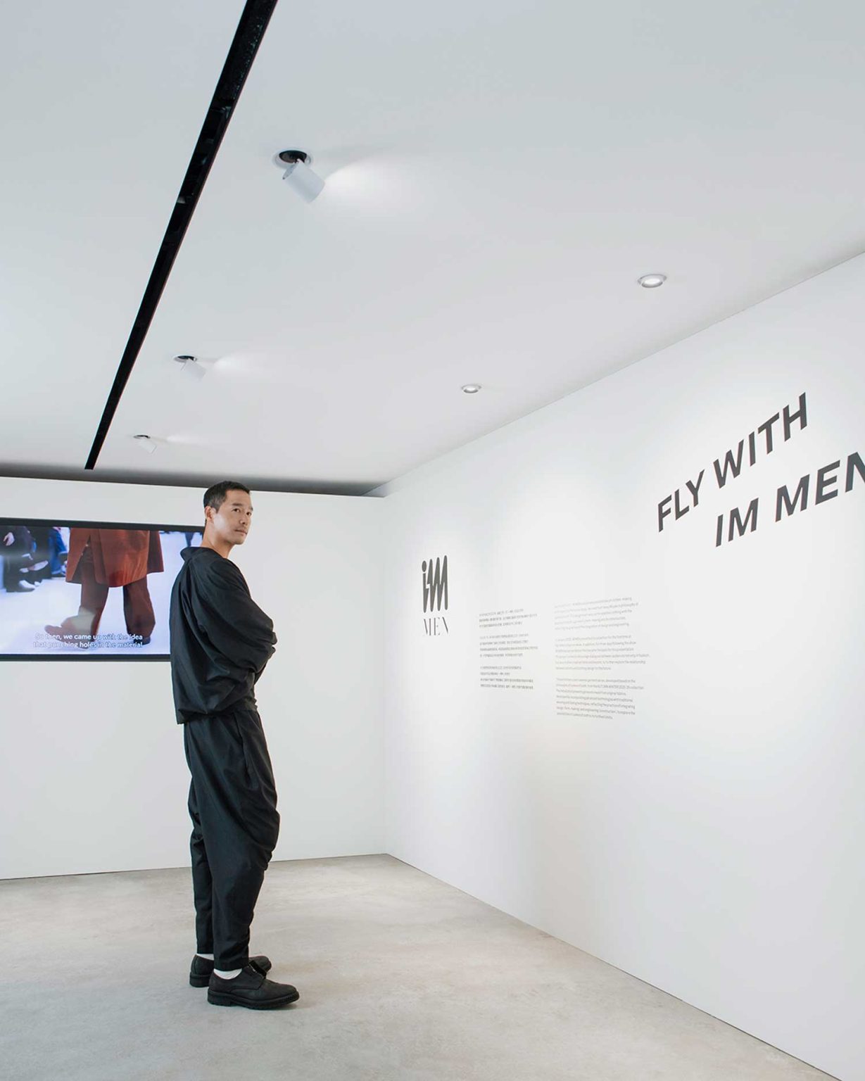 「當我穿上 IM MEN 的服裝時,我覺得自己就像那個雕塑的載體,」他說。「那是一塊有生命的布料,我可以改變它的扣法、線條,它會隨著我的身體重新構成形狀。」