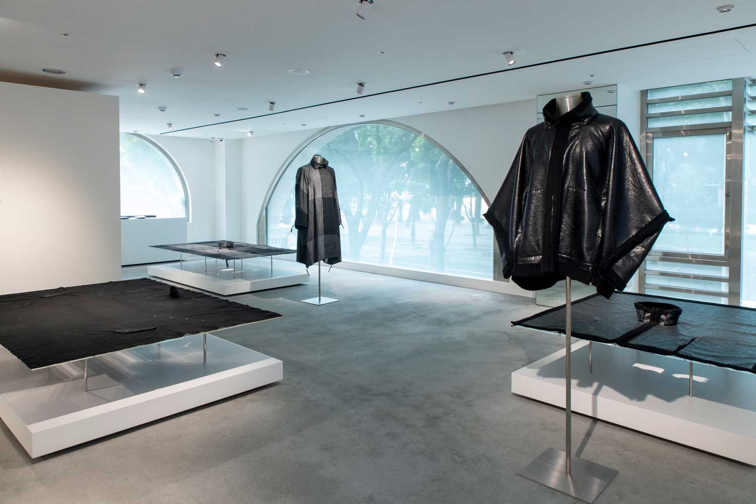 展場二樓陳列著 25AW 系列作品,包括 KASURI、HERON、METALLIC ULTRA BOA 與 FLY 四大主題,皆圍繞布料開發、工藝提煉與科技實驗的交融概念展開