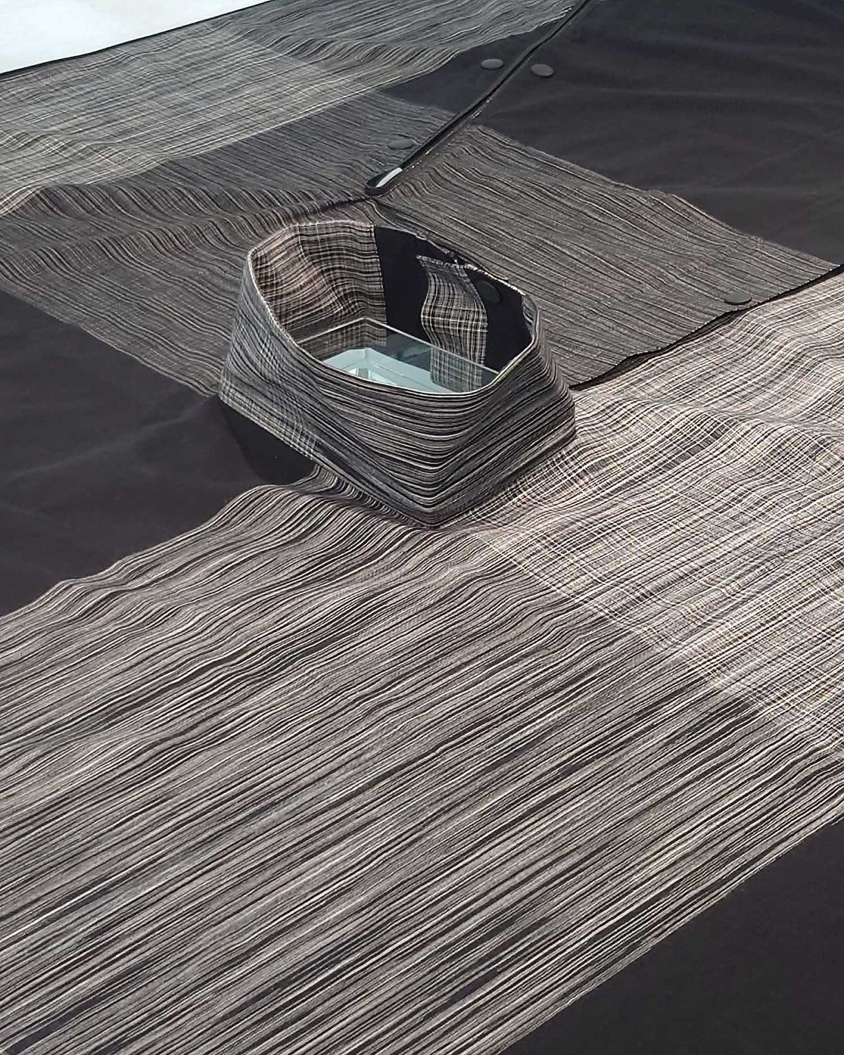從傳統絣染到新型科技纖維的融合,從自然筆觸延伸至空氣雕塑。牆面上展示了工藝過程與布料截面,觀眾彷彿走入一座解構後的工作室,看見「時間」如何在一塊布上留下層次與呼吸。