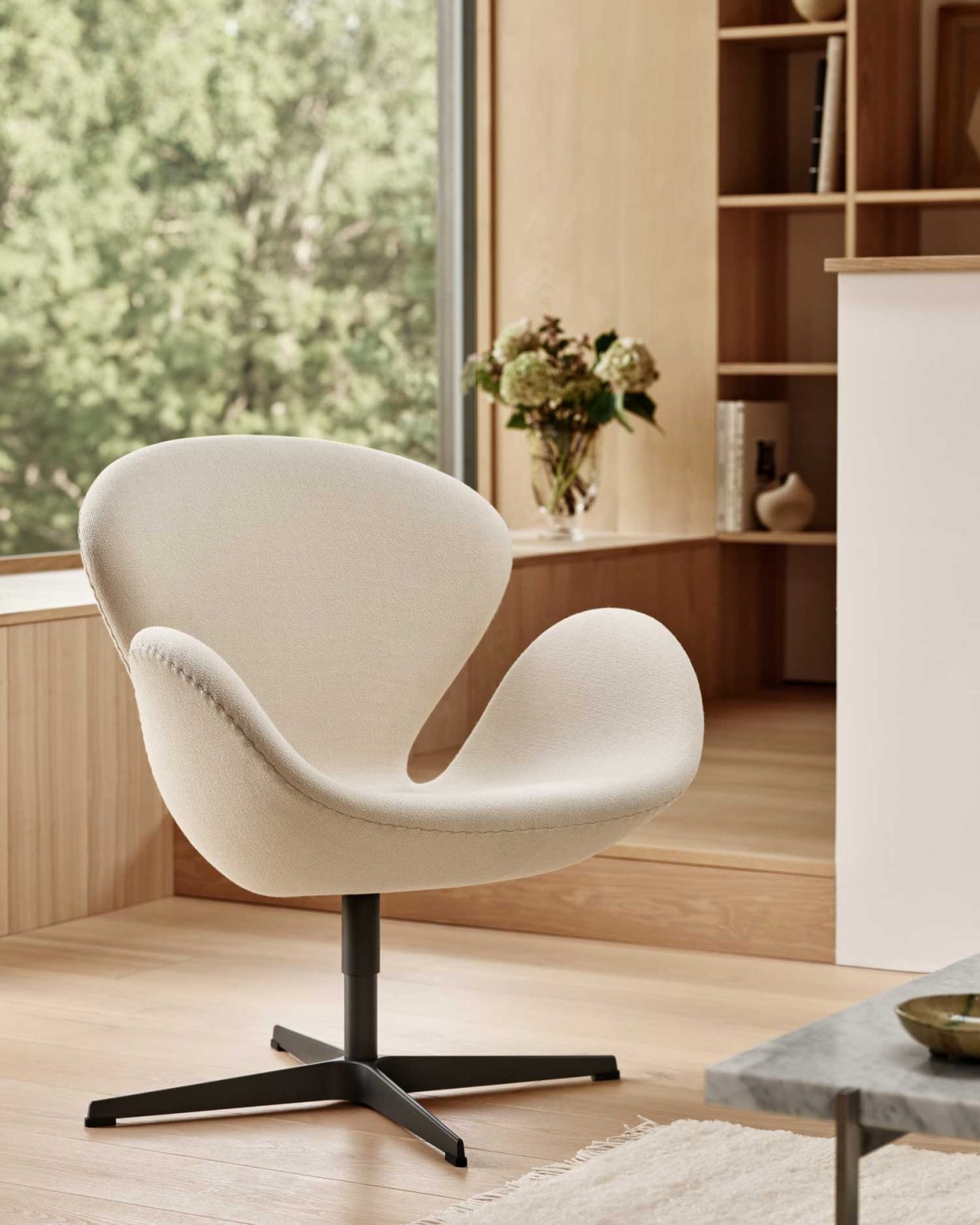 Arne Jacobsen 於 1958 年為哥本哈根 SAS 皇家酒 店設計的經典之作—Swa n™( 天鵝椅 )。以無直角的 連綿弧線構成,線條優雅流 暢,展現自然與柔和的設計 語彙,彷彿讓人隨時能沉浸 在舒適之中。