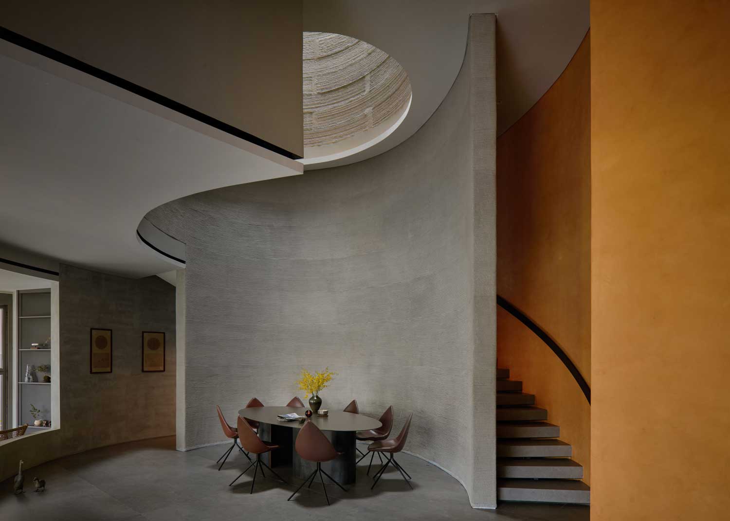 懸浮於餐廳上方的中空結構,不僅是室內熱調 節系統,更是整體採光的視覺焦點。日光自天窗灑 落,隨著時間流轉,光影在室內變幻流轉,賦予空 間不同韻味。