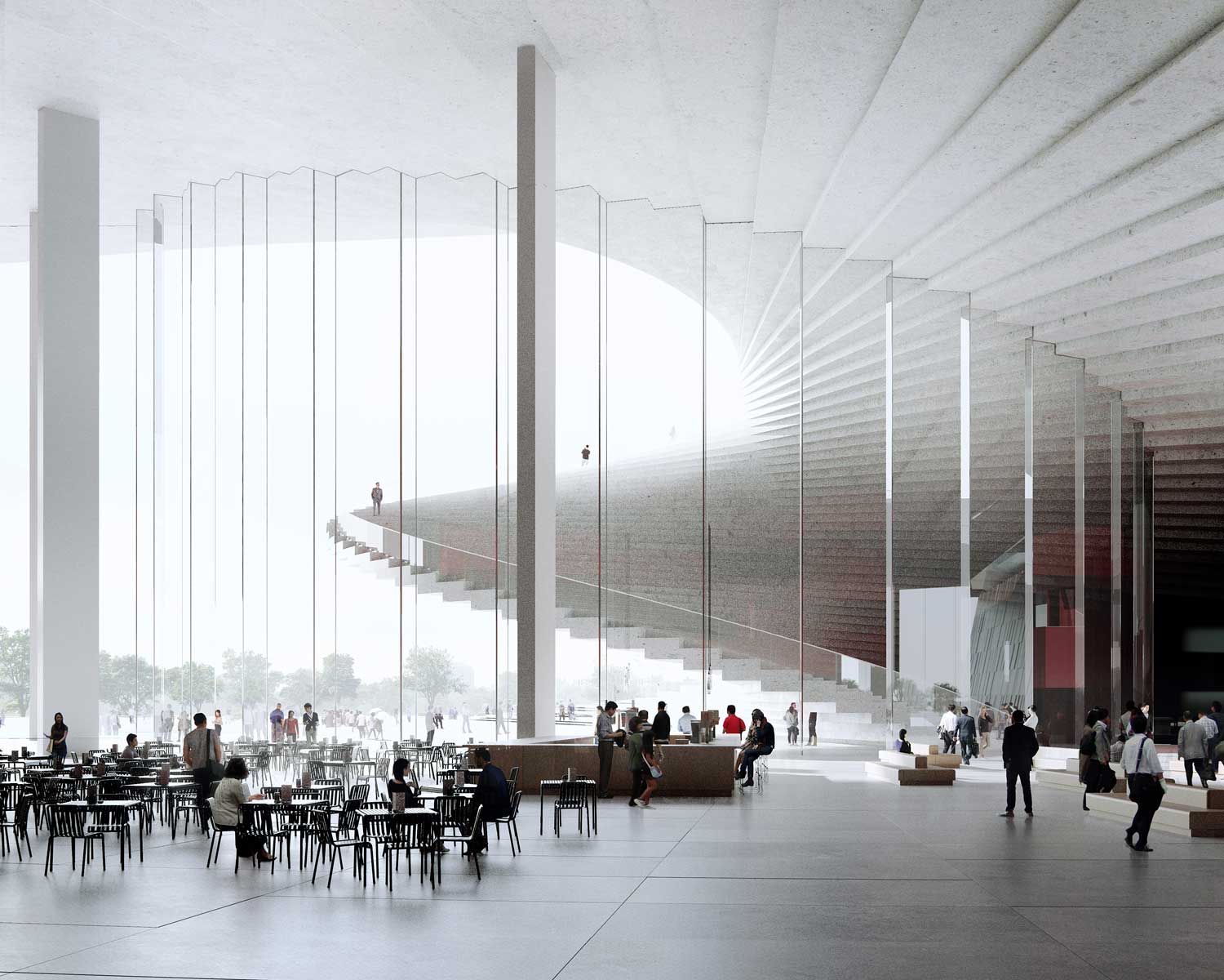 螺旋與扇形的設計理念同樣延伸至室內, 挑高大廳展現放射狀的層次變化,大面積玻 璃帷幕引入自然光,隨時間推移灑落室內, 帶來流動的光影變化,讓空間始終明亮通 透。