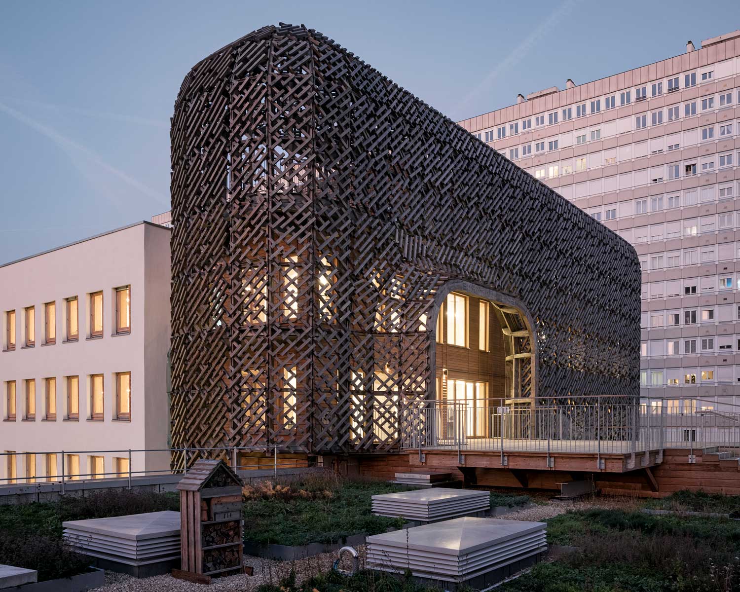 由法國建築事務所Associer 設計的James Baldwin Media Libra ry and Refugee House,以生態友善與建築再生為核心理念,將 1970 年代的舊建築翻新並擴建。擴建部分以木材與再生材料構 築,減少碳排與資源消耗;室內設計則著重自然採光與通風,在 保留原有結構的同時,引入大面積透明窗、天井與挑高空間,使 日光自多角度滲入;低位通風口與百葉窗的設計則引導自然風流 動,形成被動式氣候調節。整體以環境性能為主導,將老建築轉 化為低耗能、可持續且開放的閱讀與社交場域。