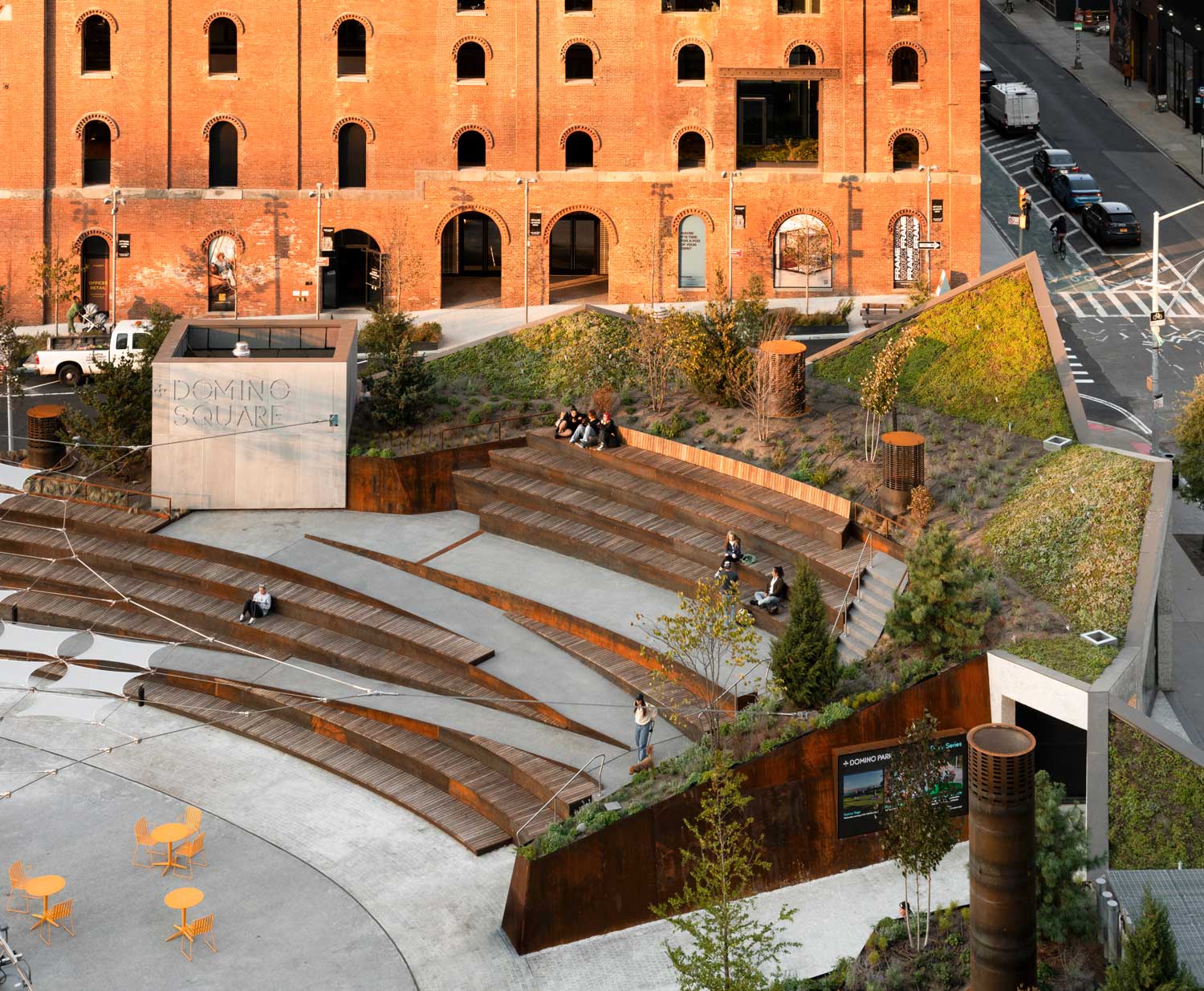 位於布魯克林區的Domino Square 是Domino Sugar Factory 重 建計畫的壓軸之作,由建築事務所Studio Cadena 與景觀設計團 隊Field Operations 攜手打造。這座公共廣場結合休憩、社交與餐 飲功能,外圍以混凝土廊柱環繞,內部規劃未來可供餐廳進駐的 店面與公園入口,營造出一種既開放又具包覆感的氛圍,讓人暫 時遠離城市的喧囂,在開闊與私密之間取得平衡。不僅打造出適 合市民自在交流的戶外場所,也呼應社區對綠地與文化活動的需 求。