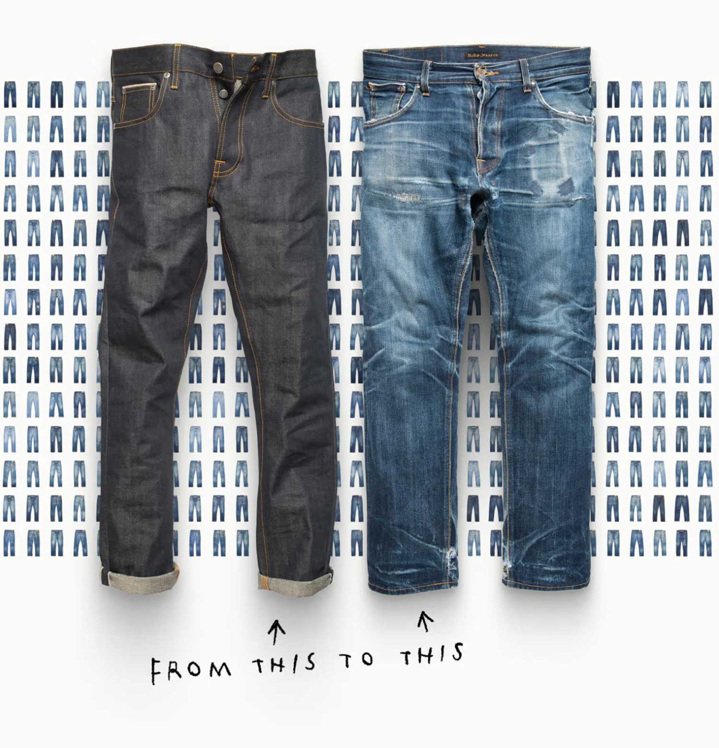 Nudie Jeans自成立以來便主張:原色褲經過每一個人的穿著,將擁有獨特的故事,這樣的牛仔褲變化,是最為自然且真實的。瀏覽Nudie Jeans官方精選世界各地養褲者的體驗,澳洲石匠紀錄了褲子與他一起工作的痕跡,德國一位父親分享孩子打翻飲品在褲子留下的溫度,他們的共同目標是-永遠穿著它。