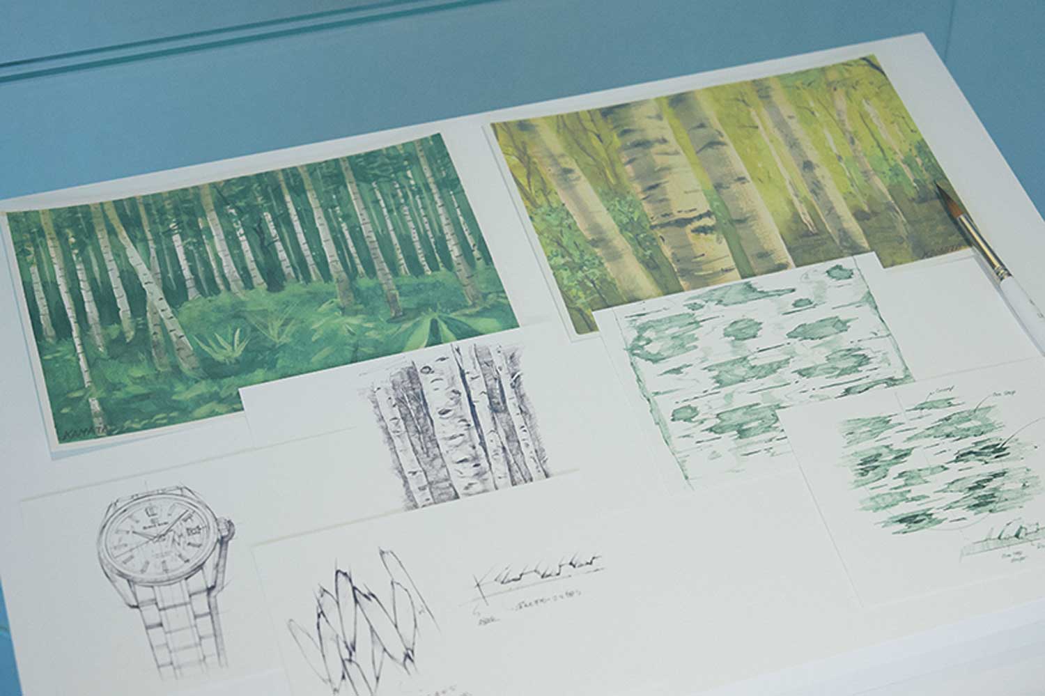 展示在「Grand Seiko Studio 雫石」二樓休息室的設計草圖。設計師將 白樺樹的樹皮質感視覺化,並將其轉化為錶盤的設計。