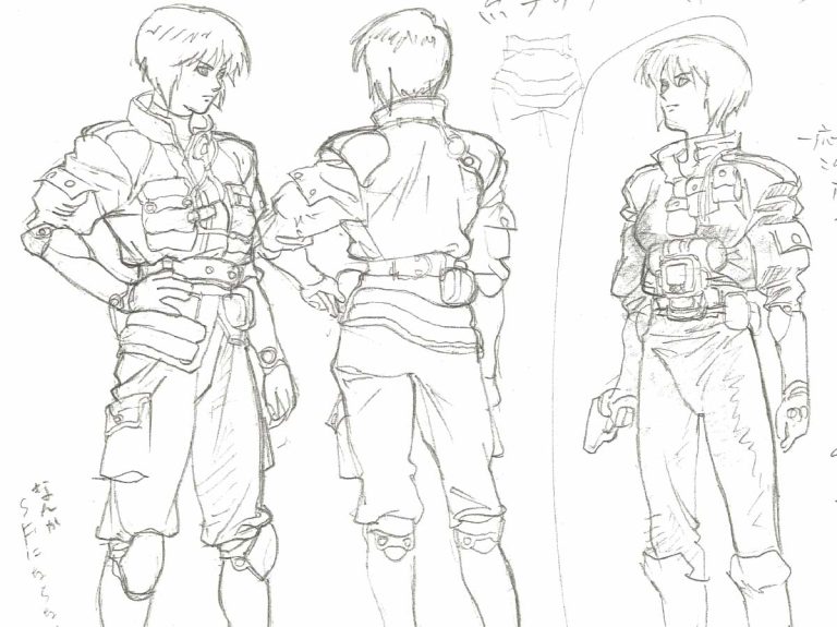 『GHOST IN THE SHELL/攻殼機動隊』中素子的設定資料。由於導演押井守堅持追求角色操作槍械時的寫實感,因此與原著中的素子相比,這版的頸部與腰圍較粗、肩膀更寬,並描繪出了筋骨強健的骨骼構造。這種設計讓人更強烈地感受到「賽博格」這個設定的真實感。觀者可以透過比較各作品中素子的髮型、體格、表情及服裝等異同,進一步去體會每位導演在作品中所寄託的情感與意圖。