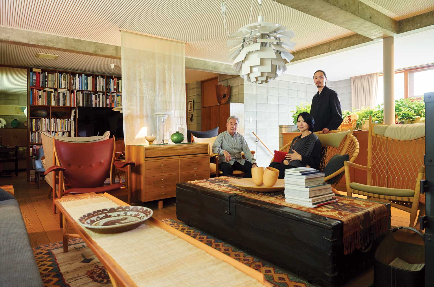 在織田自宅的客廳空間裡,擺放 著 Finn Juhl 費恩・尤爾的 Chieft ain chair 酋長椅、Hans J Wegn er 漢斯・J・威格納的 PP130 Cir cle chair 圓形椅等經典名作。客 廳中央則放置了一座在古董店發 現的李氏朝鮮時代的金庫,織田 將其作為桌子使用。