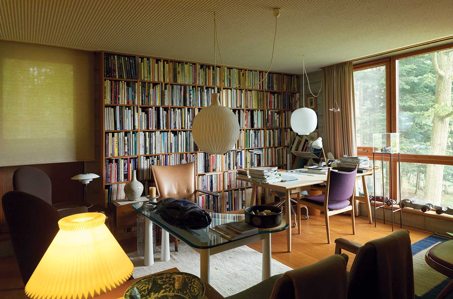書齋中擺放著織田愛用的 Hans J Wegner漢斯・J・威格納所設計的書桌與Swivel chair 旋轉椅。旁邊還有 Finn Juhl 費 恩・尤爾的 Whisky chair 威士忌椅,以及從尤爾夫人那裡直接獲贈的原型試作椅等。