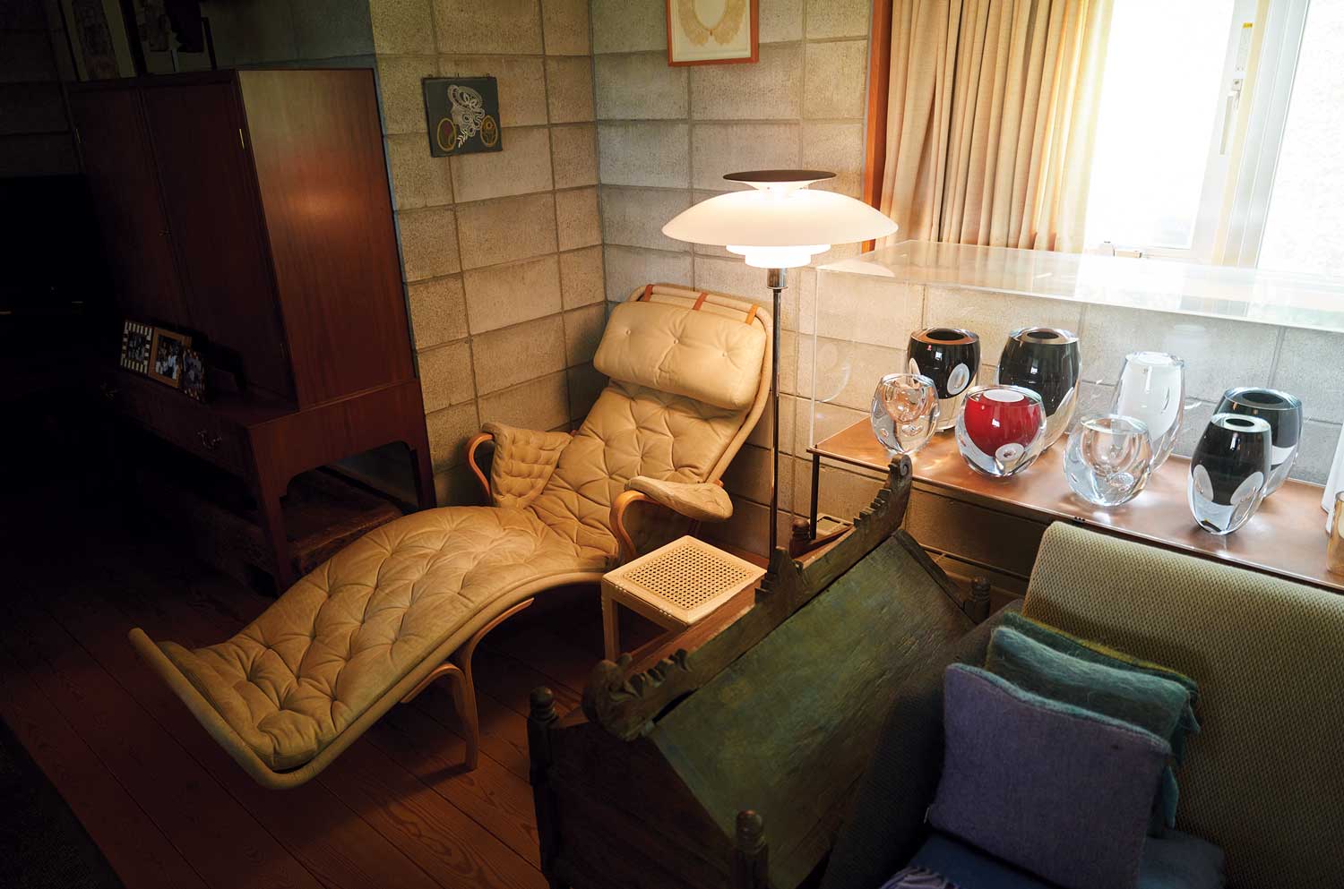 織田曾說,讓他感到最放鬆的空間,是客廳壁爐前擺放著 由 Bruno Mathsson 布魯諾・馬松設計的躺椅。愛犬喜樂蒂 還在世的時候,總是習慣窩在織田的雙腳之間,那是牠的 專屬固定位置。
