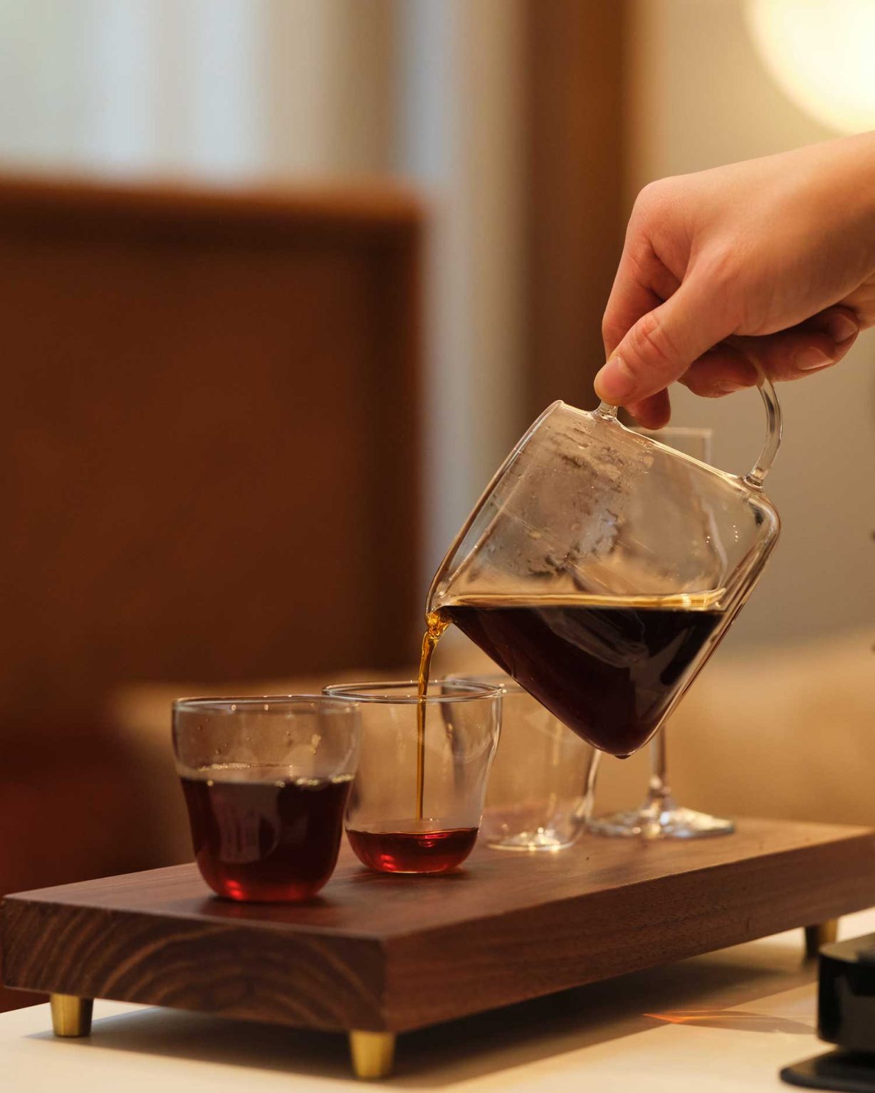 白日裡,鵲羽軒是早餐與咖啡的場域。自然光隨時間推移,灑落在沙發的曲面上,賓客能在這氛圍裡啜飲一杯由咖啡師桌邊沖煮的精品咖啡。入夜後,燈光轉為低調溫潤,鵲羽軒則化身為城市的微醺沙龍。調酒師取材自藍鵲、五色鳥、烏頭翁等台灣鳥種,將水果、茶香與在地食材融入調酒,創造出詩意而獨特的風味。