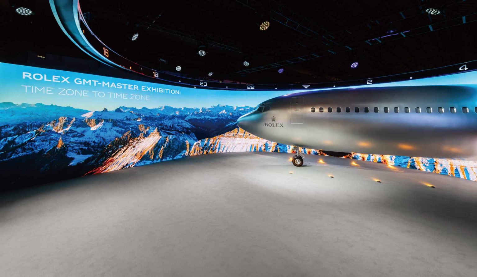 勞力士 GMT-Master「穿越時區」展覽中的 3D 飛機裝置,重現 1950 年代航空場景,呼應 GMT-Master 腕錶問世的時代背景。