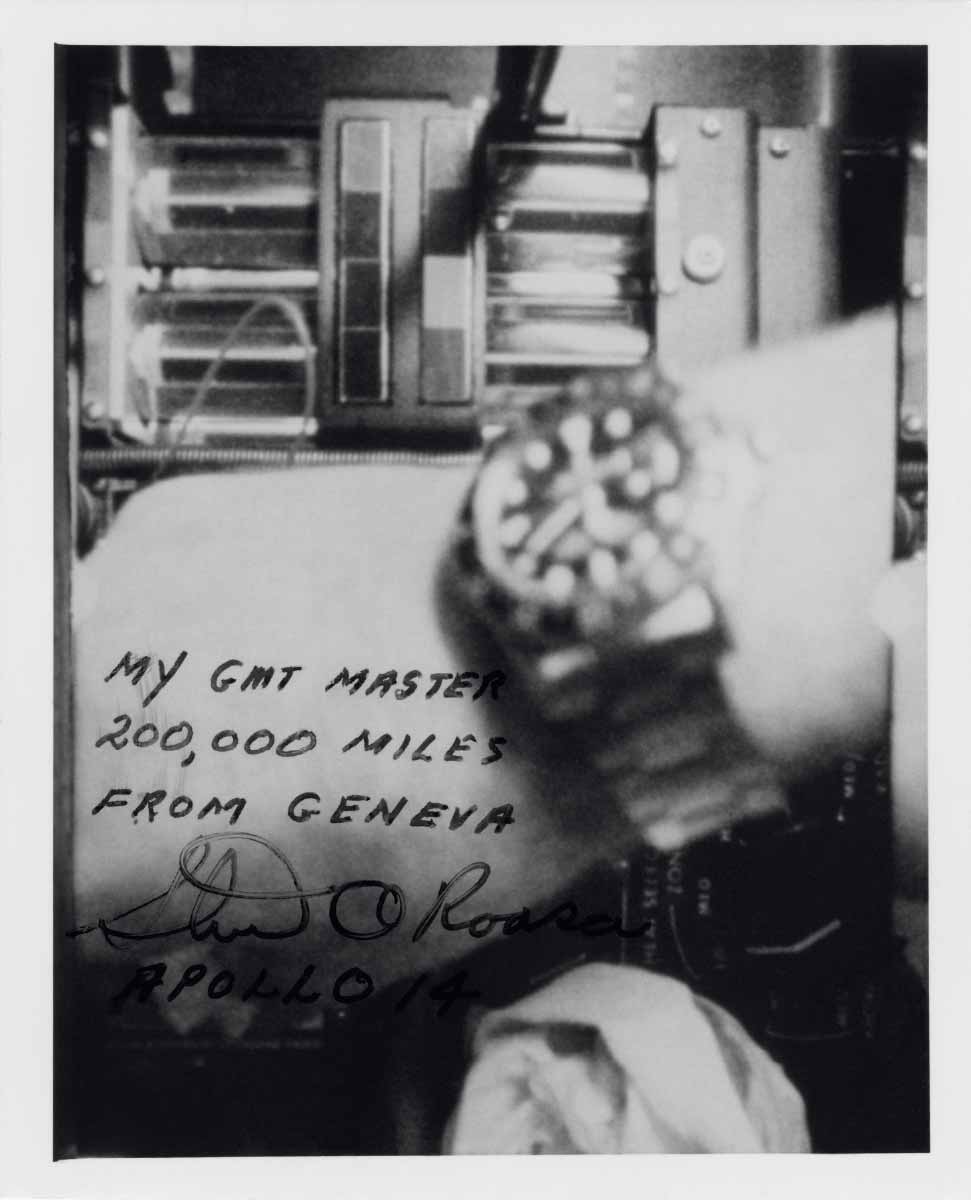 太空人斯圖爾特・A.・羅薩在執行太陽神14號任務期間為自己佩戴的GMT-Master腕錶拍攝的照片,附本人親筆留言
