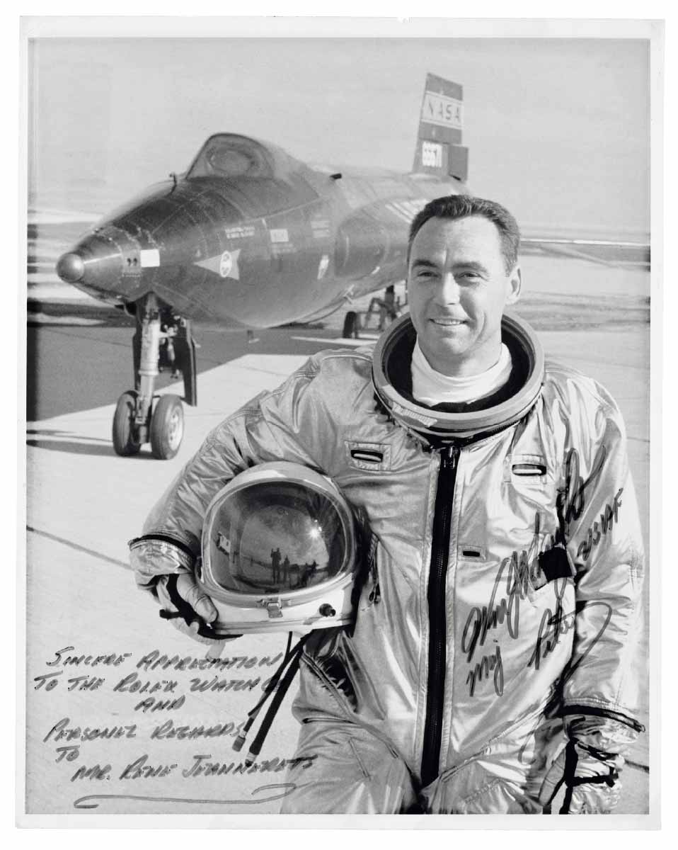 中尉兼航空工程師威廉・J.・黎特的照片。1967年10月3日,他佩戴著GMT-Master腕錶,駕駛X-15型火箭飛機創下時速高達7,274公里(6.7馬赫)的歷史紀錄