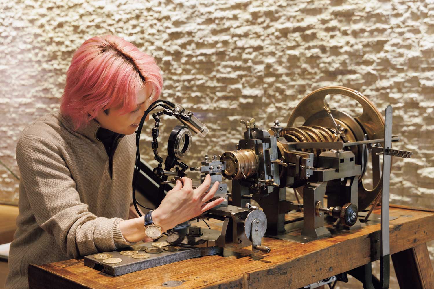 店內保存著一台製於 1850 年的雕金裝飾車床,並保持 在可運作狀態。在工作人員 的解說下,實際挑戰了 Guillo ché 機刻雕花裝飾,對其工 藝的細膩深受感動。