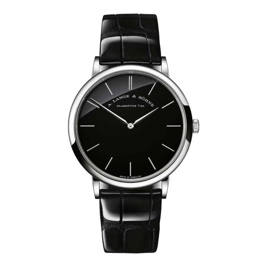 朗格 Saxonia Thin 採極簡設計理念,以鉑金錶殼與亮黑縞瑪瑙錶盤構成純粹美感。厚度僅 6.2 毫米,搭載自製 L093.1 手上鍊機芯,提供 72 小時動力儲存。機芯厚度僅 2.9 毫米,透過藍寶石底蓋可見其精緻手工打磨。此 作體現朗格一貫的德式嚴謹與薩克森工藝之優雅精神。