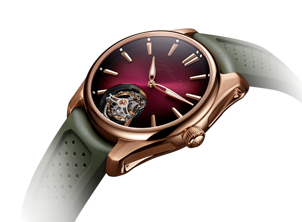 在生氣盎然的製錶世界中,H. Moser & Cie. 亨利慕時精準捕捉珍罕的精髓,推出開拓者陀飛輪酒紅色腕錶(Pi oneer Tourbillon Burgundy)。這款時計融合優雅與堅韌特質,憑著防水深度達 120 米的 5N 紅金錶殼,無論是 陸地或水中皆能游刃有餘。40 毫米錶殼中搭載配有雙游絲的 HMC 805 飛行陀飛輪自動上鏈機芯,酒紅色煙 燻錶盤為開拓者系列注入新氣象,在捕捉光線的同時,也突顯紅金的溫暖質感。 看似簡單的外表之下,隱藏著一項工程傑作:配備雙游絲的陀飛輪機芯,可校正游絲在伸展時重心點的位移, 大幅提升準確性與等時性,並減少單游絲常見的摩擦阻力效應。HMC 805 機芯透過部分鏤空橋板,使傳動輪 系與雙向自動上鏈系統一覽無遺,擺陀經倒角處理,確保至少 3 天動力儲存,使腕錶無論在都市或野外探險 皆能應付自如。