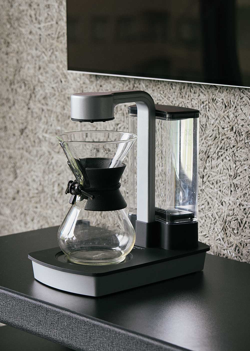 這個在拍賣會場上入手的 CHEMEX 咖啡機為市 面上沒有的款式,握把部分採用了塑膠材質, 「跳脫經典的木製設計,不僅更好拿、更好用, 低調的黑色顯得內斂又有個性。」