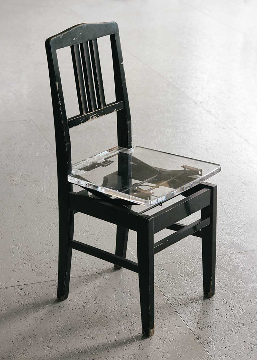 原本即將被丟棄的鋼琴椅,由他人轉讓而得以免 費入手。尾花將其重新改造,座面換上了透明壓 克力材質。這張椅子如今也被運用在品牌的展示 空間以及店鋪當中