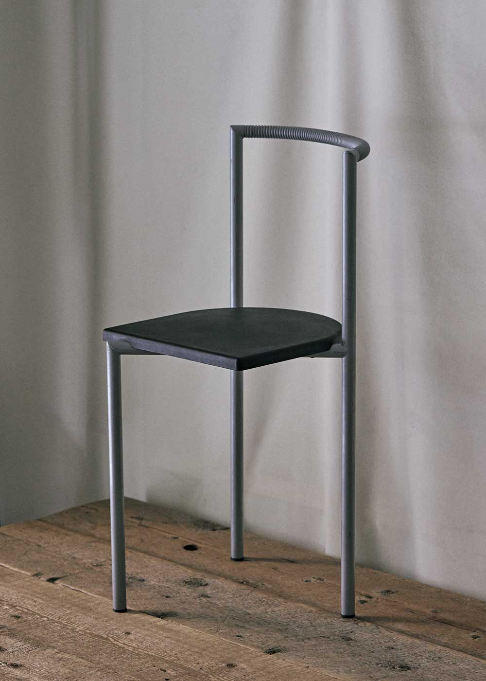 N. HOOLYWOOD設計師尾花大輔於自家餐廳中所愛用的,是由義大利建築師Paolo Pallucco保羅・帕盧科與Mireille Rivier米蕾尤・李維耶共同設計的「Stalker Chair」。坐在這張三腳椅上時,會讓人自然地呈現用肩膀和手肘放鬆傾斜的姿勢。是張如同藝術品般的椅子。