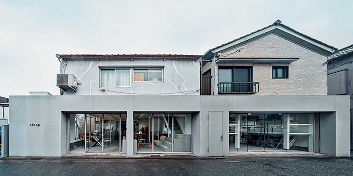 「stoop」的外觀。空間延伸至照片右側建築的一樓,並新設了灰色的立體門面。這一帶仍保 留許多戰後復興時期的民宅、商店與工廠,同時也陸續出現如東京都現代美術館、精品咖啡 店與餐廳等新興設施。在古老街景與嶄新價值觀的交融之下,形成了獨特且充滿魅力的氛 圍。