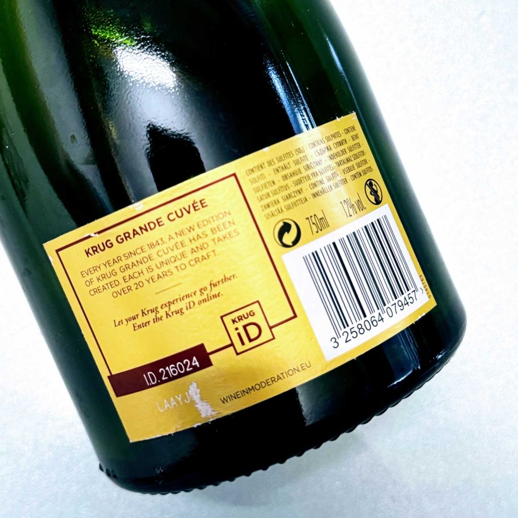 每一瓶 Krug Grande Cuvée 除了正面標示 Edition編號 之外,背標還附有專屬 ID,讓飲者能透過官網或 Krug App 查詢該版本的釀造細節,包括基礎年份、混調比 例以及儲備酒來源。